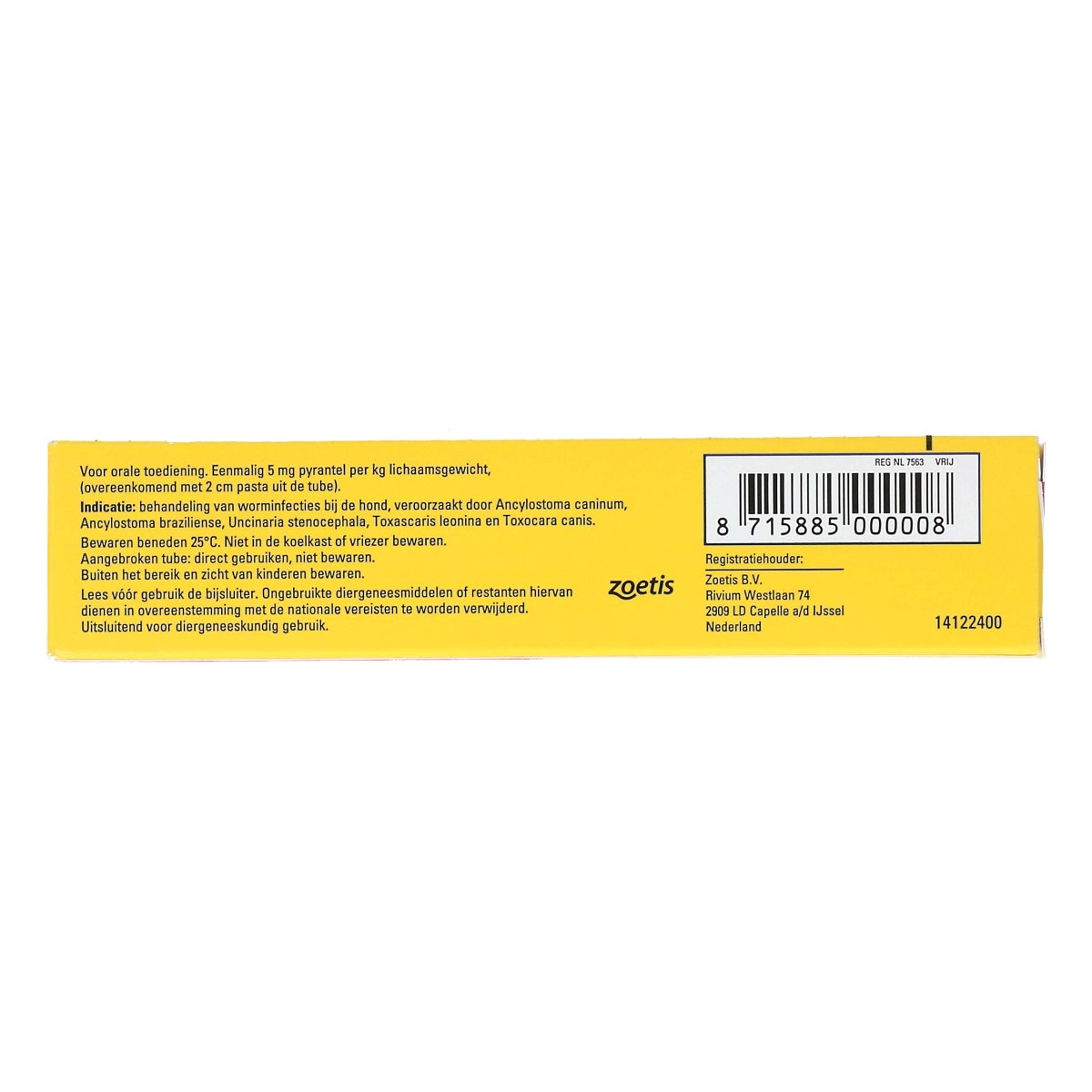 - Eenvoudige dosering van 14,4 mg pyrantelpamoaat per kg lichaamsgewicht