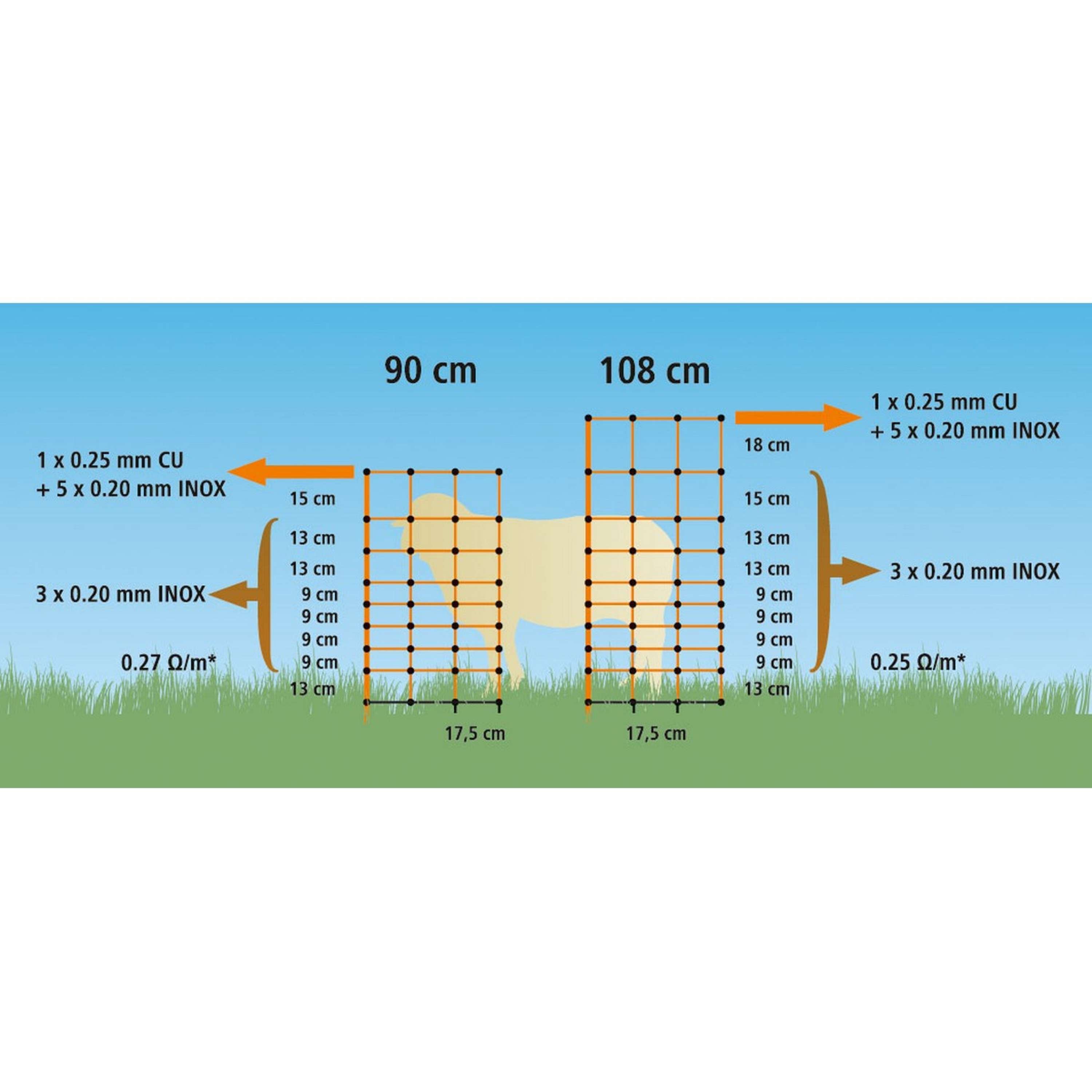 Dankzij de speciale combinatie van koperen en roestvrijstalen draadjes in het net, is de weerstand superlaag (0.27 of 0.25 Ohm/m). Dit betekent dat het net goed stroom geleidt en de dieren binnen de omheining houdt, terwijl potentiΓ«le aanvallers buiten blijven.