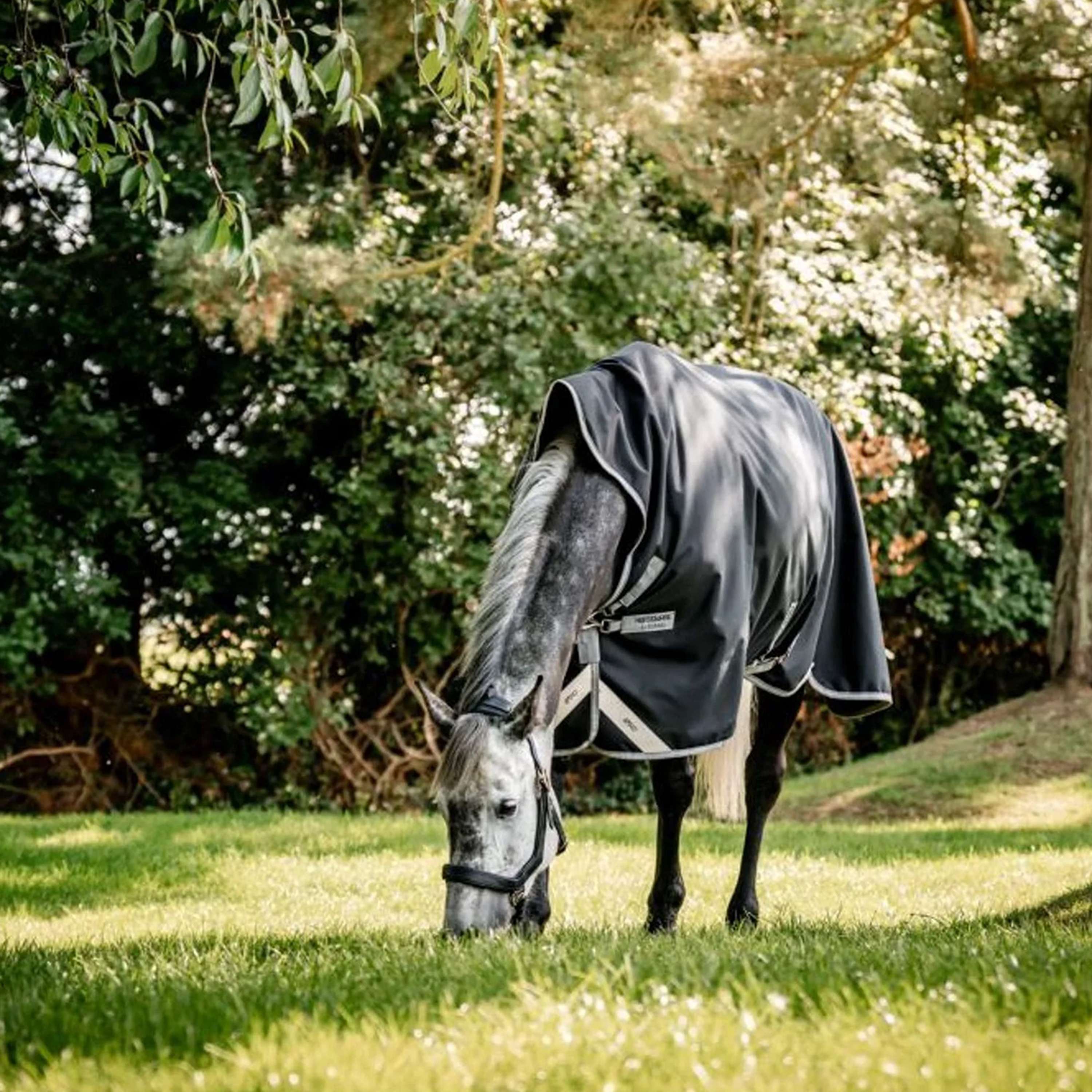 Met een V-sluiting aan de voorkant die de druk op de schouder wegneemt, wat zorgt voor meer comfort tijdens het grazen. Dubbele beenbogen, om de bewegingsvrijheid te behouden terwijl het deken stevig onder de buik blijft zitten. Reflecterende strips voor verhoogde zichtbaarheid en 3 kruissingels.