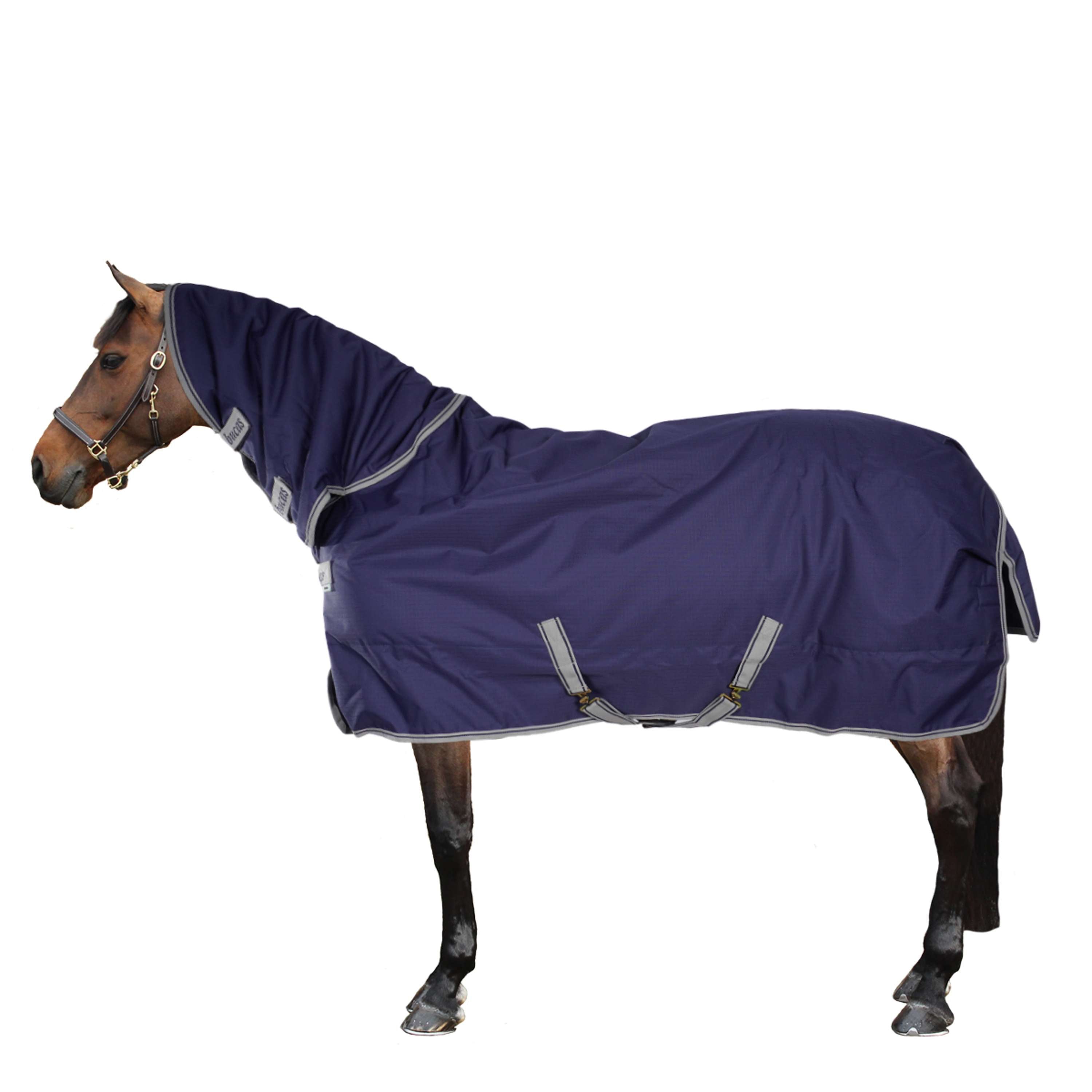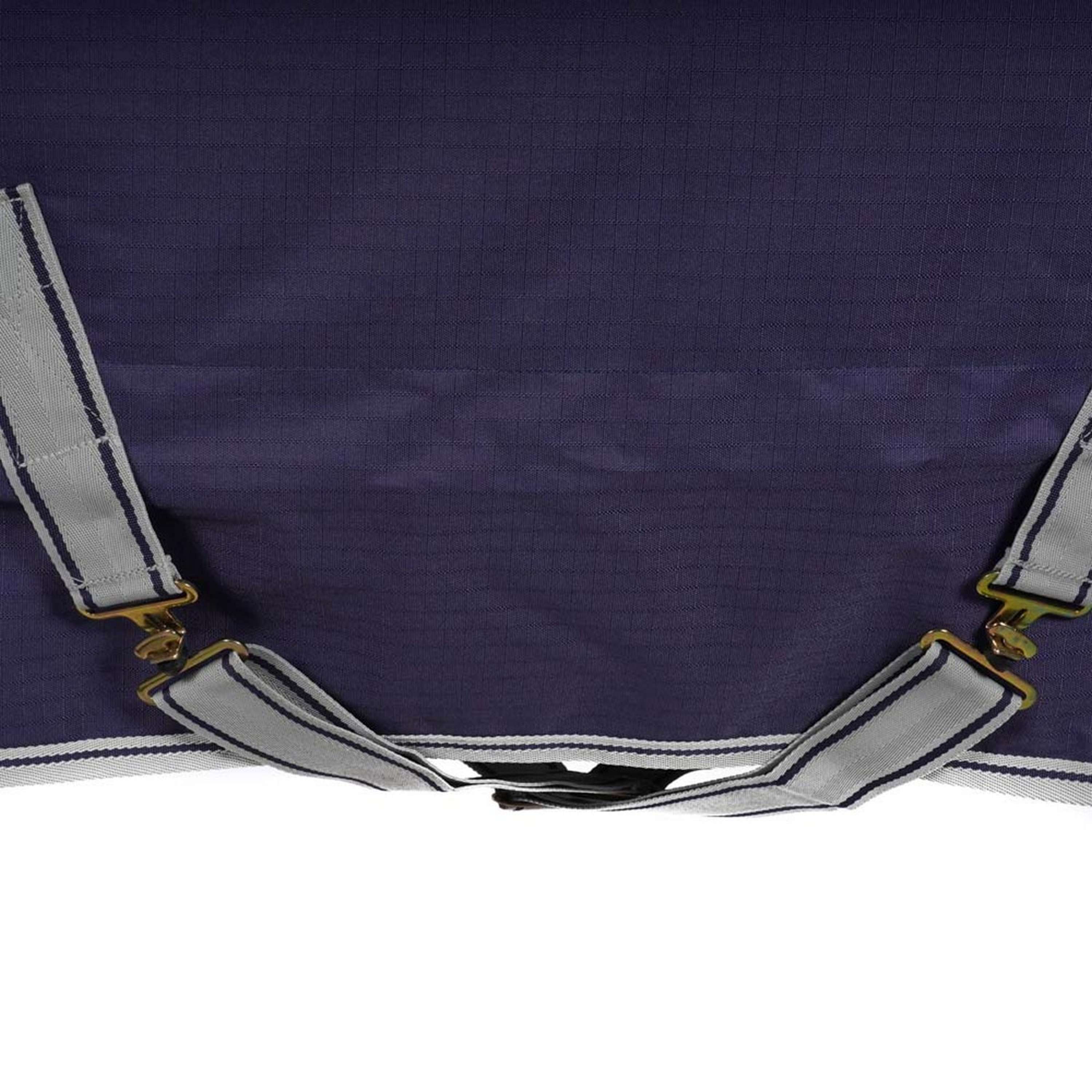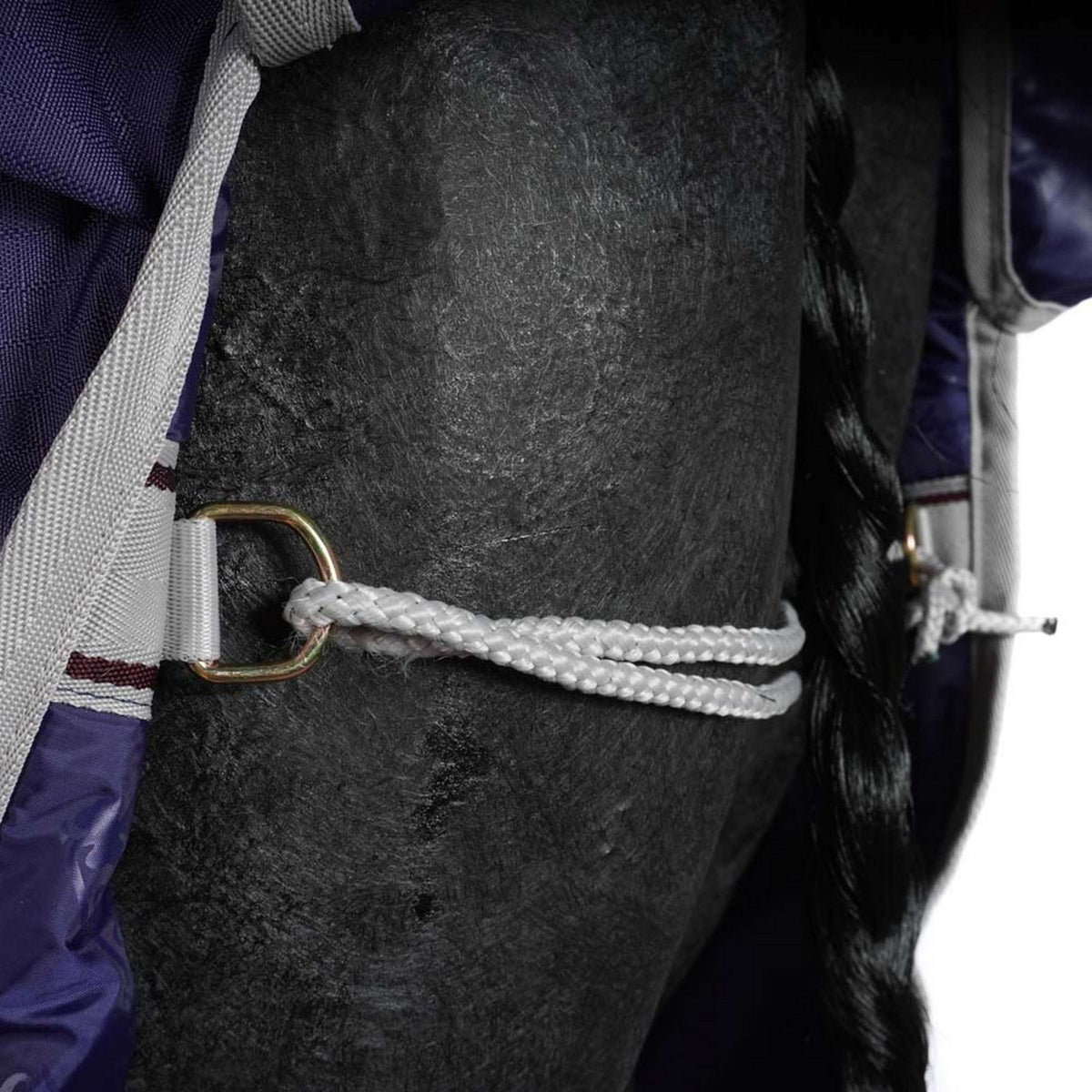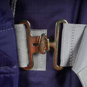 De deken heeft een stevige voorsluiting met Click 'n Go-systeem, bestaande uit twee haken die je netjes kunt verbergen met een klittenbandflap. De verstelbare kruissingels zorgen ervoor dat je de deken makkelijk passend maakt voor je paard. Achterop de deken zit een bilkoord om alles goed op zijn plek te houden. Wil je liever bilriemen gebruiken? Dat kan, maar die zitten er niet standaard bij.