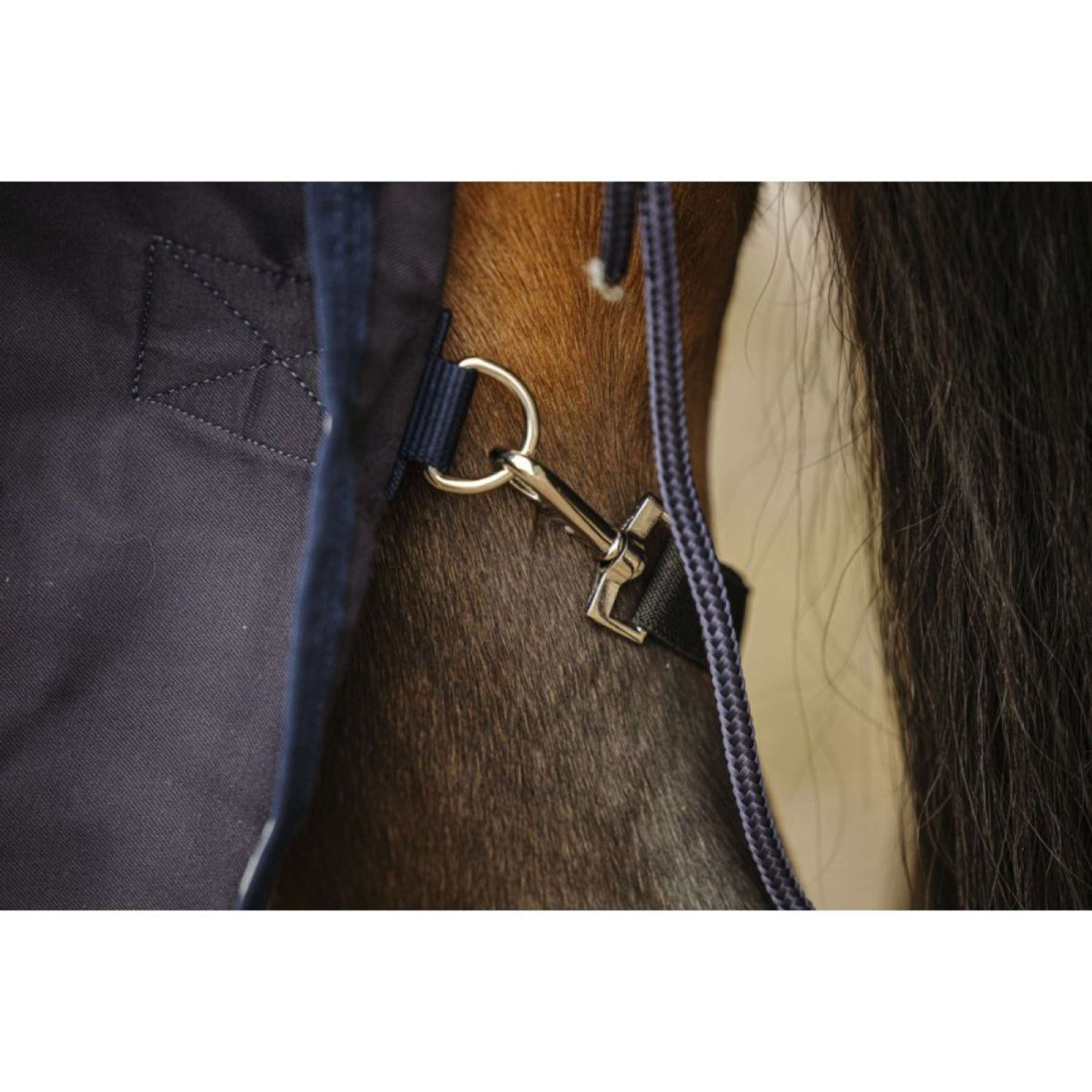 De verstelbare mannelijke/vrouwelijke sluitingen en gekruiste buiksingels met elastiek zorgen ervoor dat de deken goed blijft zitten. Daarnaast is er een schoftbeschermer van synthetisch schapenvacht en elastische bilriemen met een staartflap, die je paard extra bescherming bieden.