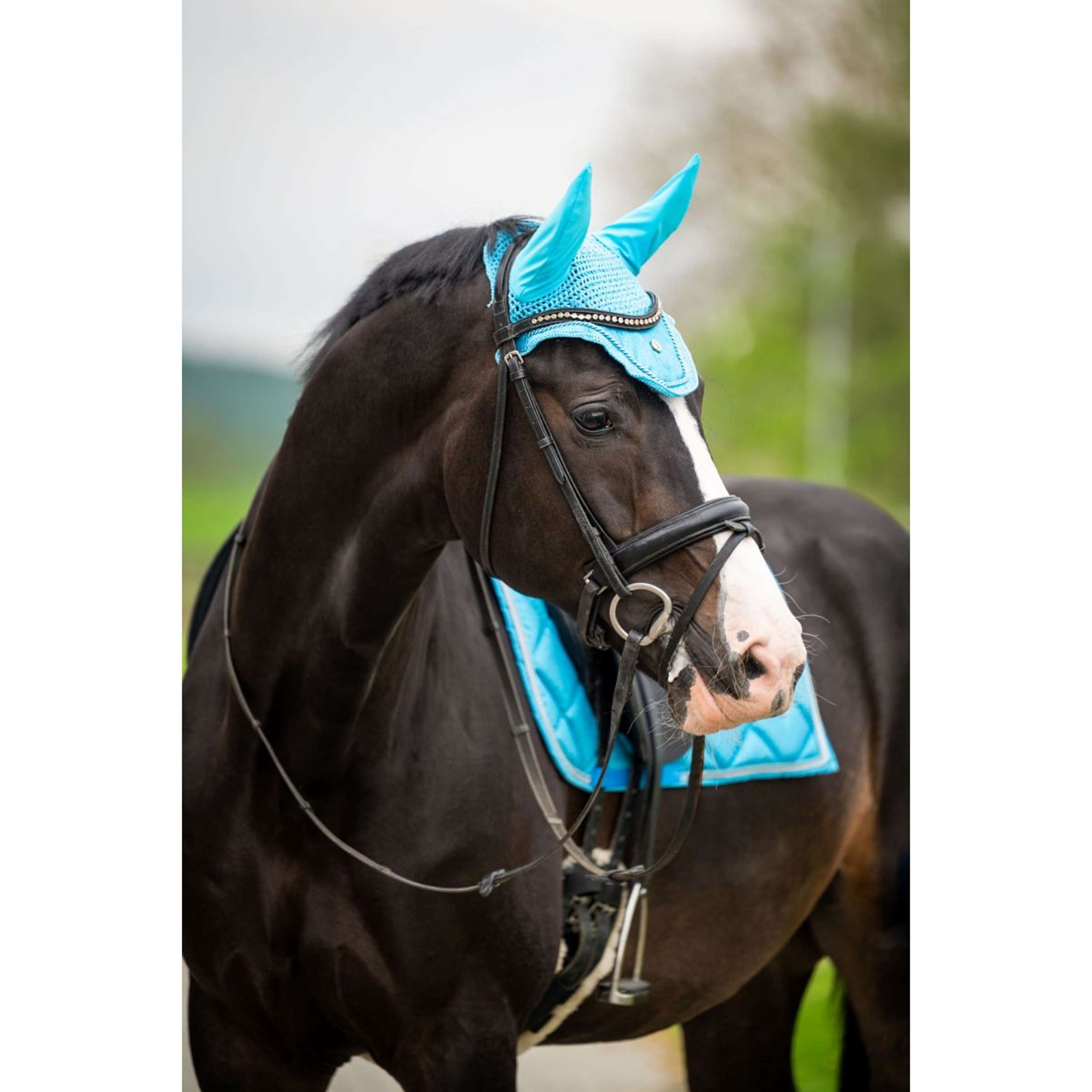 Met dit oornetje bescherm je de oren van je paard tegen vervelende insecten en het dempt geluiden, zonder in te leveren op stijl. De glitterdetails geven het oornetje een chique uitstraling, perfect voor wedstrijden of gewoon om extra op te vallen.