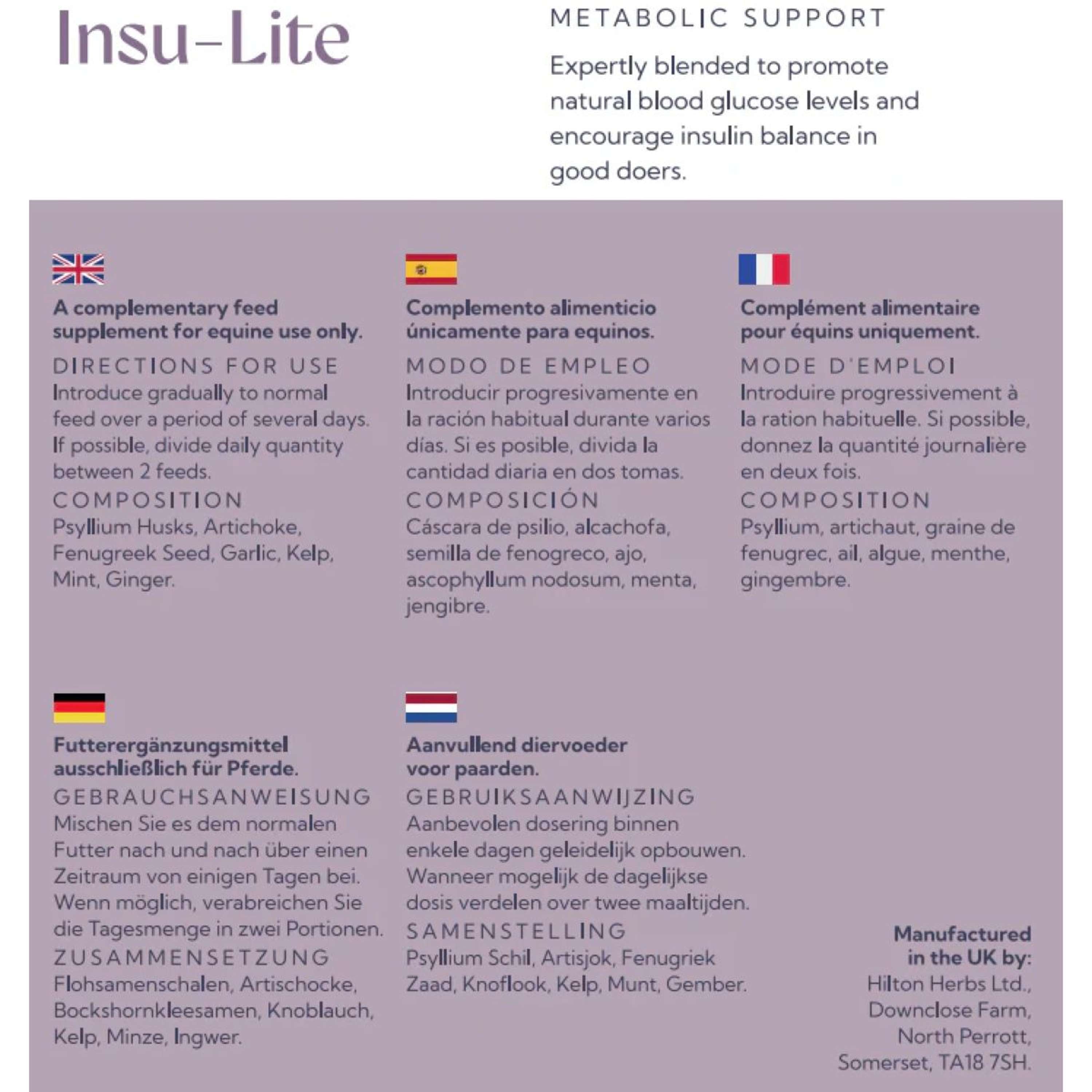Insu-Lite bevat kruiden zoals psyllium, knoflook en gember, die zorgvuldig zijn uitgekozen voor paarden en pony’s die van nature in schrale gebieden leven. Deze dieren moeten dagelijks grote afstanden afleggen om voedsel te vinden. Onze gedomesticeerde paarden krijgen vaak krachtvoer en dekens, waardoor ze sneller overgewicht ontwikkelen. Dit kan serieuze gezondheidsproblemen veroorzaken. De kruiden in Insu-Lite helpen bij het handhaven van een normale bloedsuikerspiegel en circulerende hormonen zoals insuline, dankzij hun hoge gehalte aan antioxidanten, methionine, biotine en vitamine E.