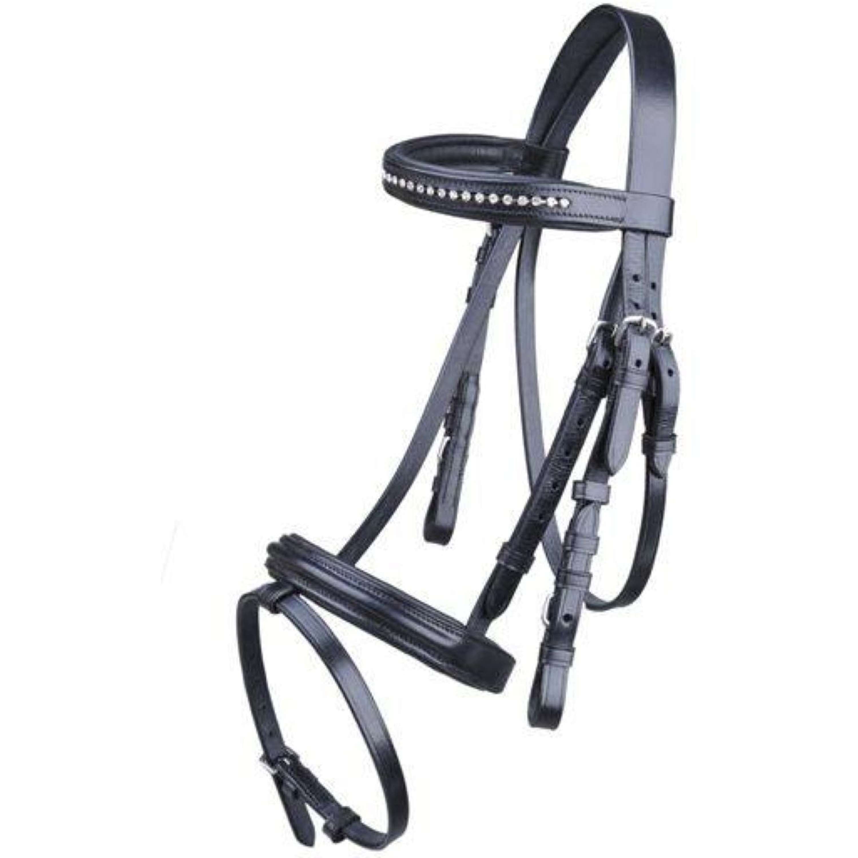 Dit hoofdstel heeft een Engelse neusriem en een frontriem met strass steentjes voor een chique uitstraling. Dankzij het zachte materiaal op de front- en neusriem zit het erg comfortabel voor je pony.