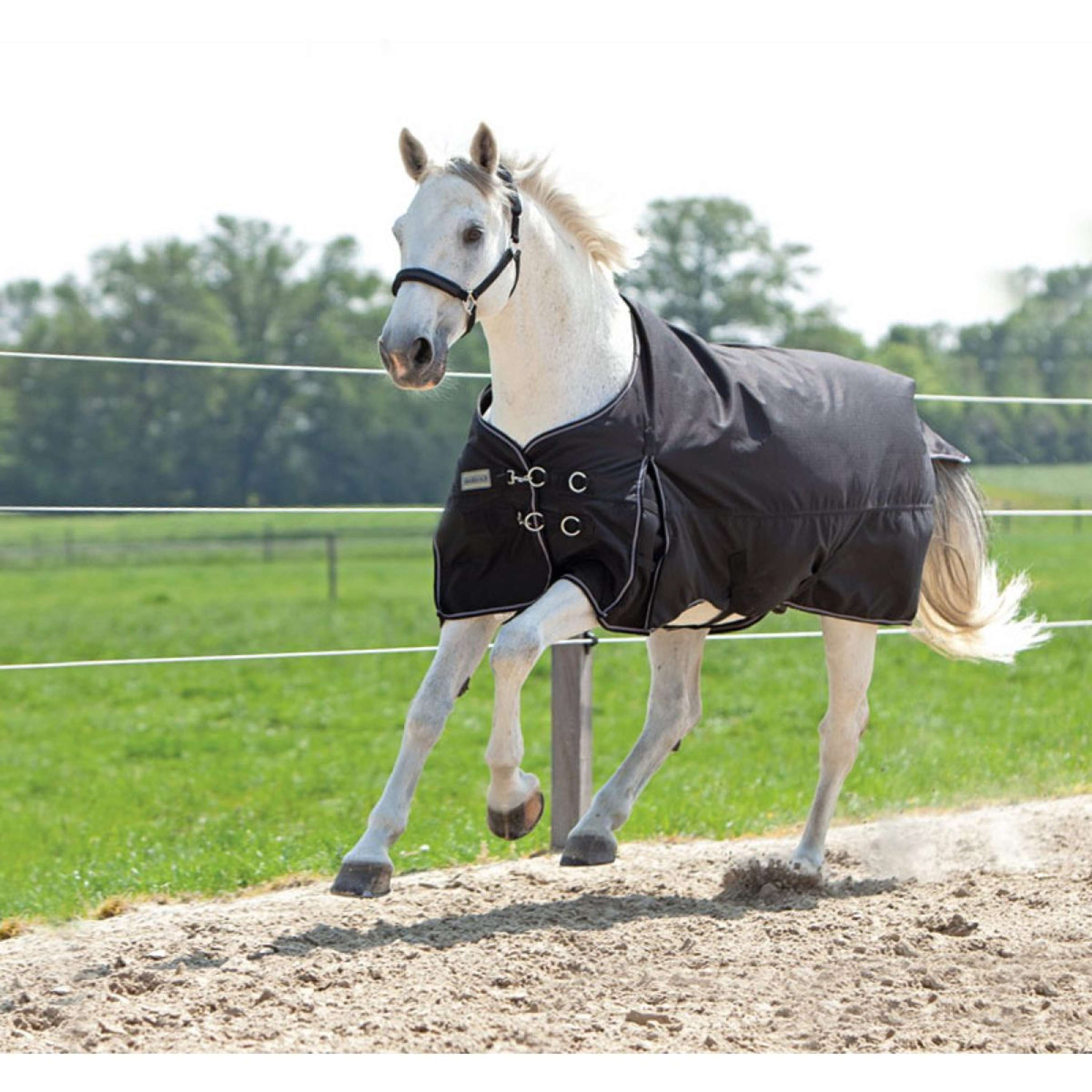 De deken is uitgerust met een dubbele rechte verstelbare voorsluiting, zodat hij altijd goed blijft zitten. De verstelbare kruissingels zorgen voor extra stabiliteit tijdens het bewegen en de reflectiestrepen zorgen voor goede zichtbaarheid in het donker. De staartflap en het bilkoord aan de achterzijde maken het geheel compleet, zodat de deken niet verschuift en alles netjes op zijn plek blijft.