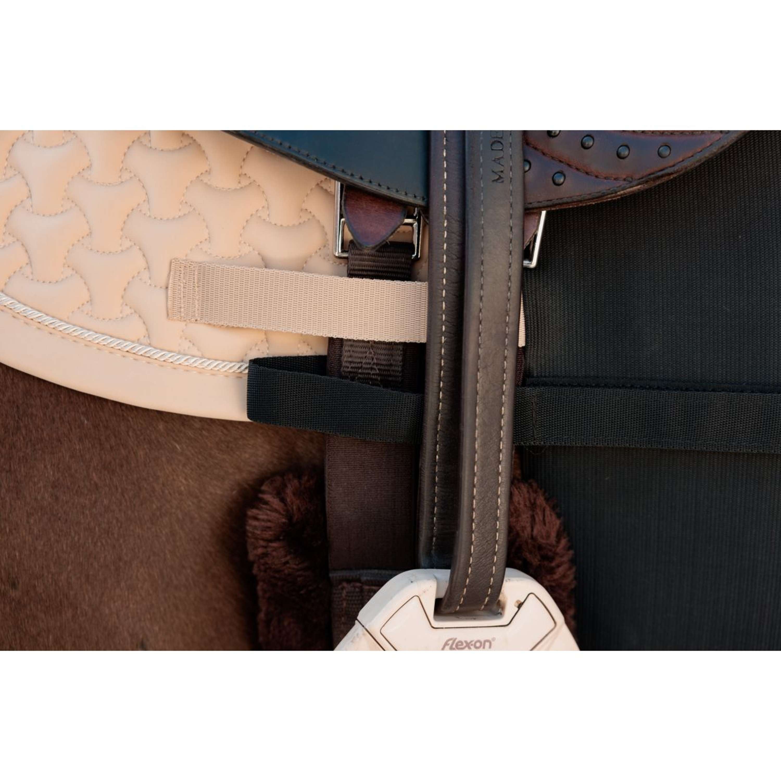 De buikband biedt betrouwbare bescherming waar paarden dit het meest nodig hebben. Gemaakt van sterk maar flexibel elastiek, beweegt het met het paard mee en blijft het comfortabel op zijn plaats dankzij het meerpuntsbevestigingssysteem. Het zachte neopreen gedeelte onder de buik zorgt voor een demping tegen druk en wrijving, waardoor het ideaal is voor paarden met een gevoelige huid of tijdens intensieve trainingsperiodes.