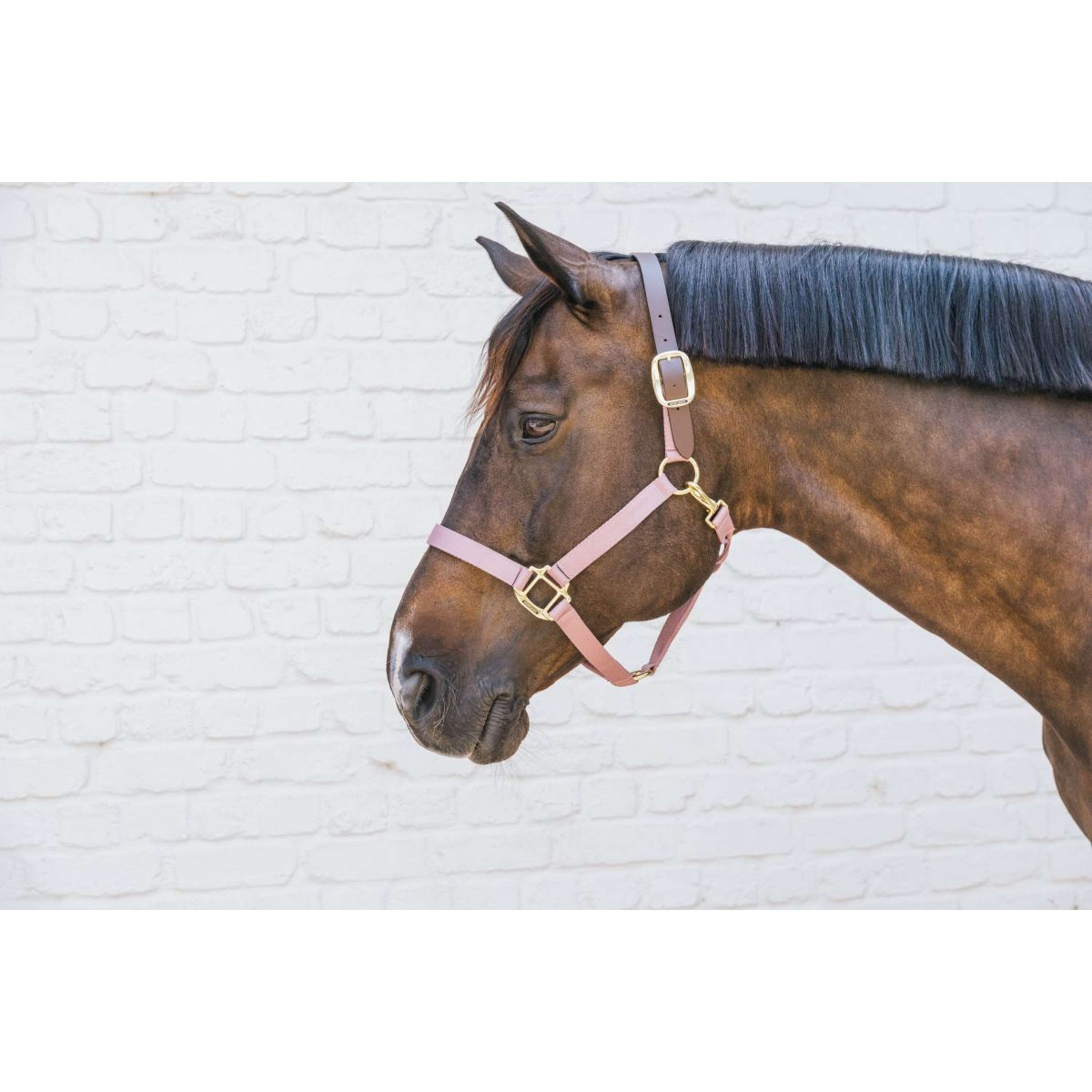 Aan beide kanten van het hoofd is het halster verstelbaar, zodat je altijd de perfecte pasvorm kunt vinden. Er zit een goudkleurig plaatje op met het logo, dat je kunt omdraaien en personaliseren.