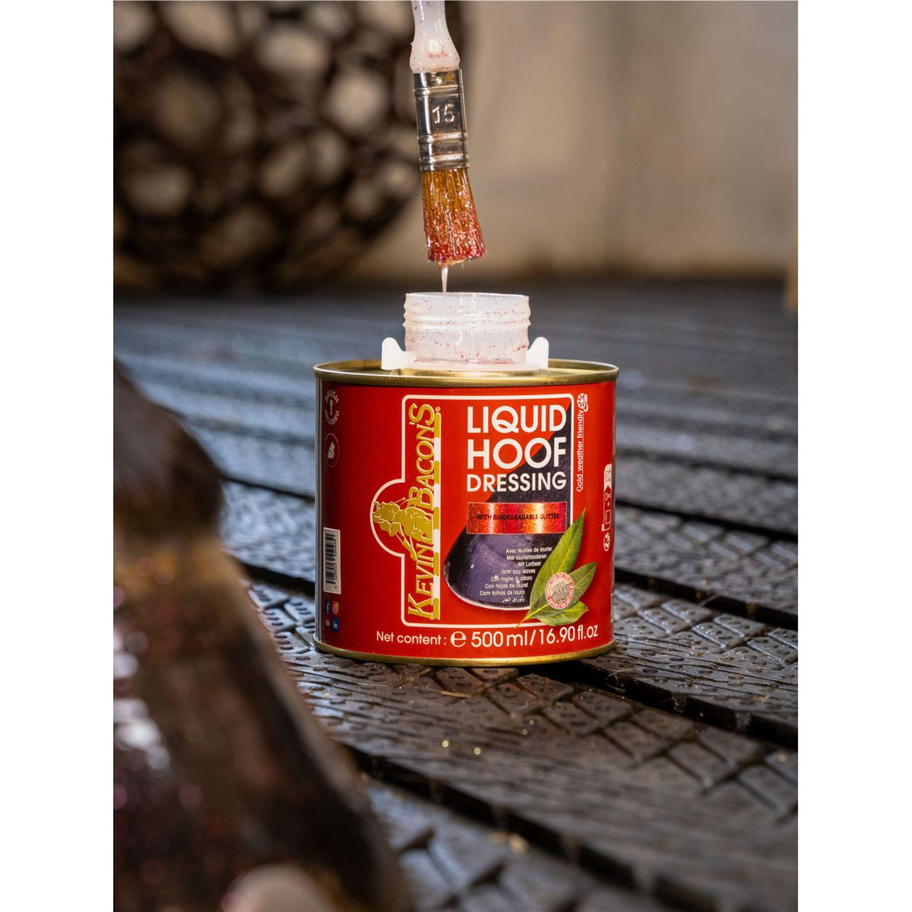 Liquid Hoof Dressing Glitter Edition is een beschermende en voedende olie voor beslagen en onbeslagen hoeven. De formule bevat biologisch afbreekbare glitter voor een glanzende en elegante afwerking. Het product beschermt tegen vocht, bevordert de elasticiteit, activeert de groei en verbetert de kwaliteit van de hoef.