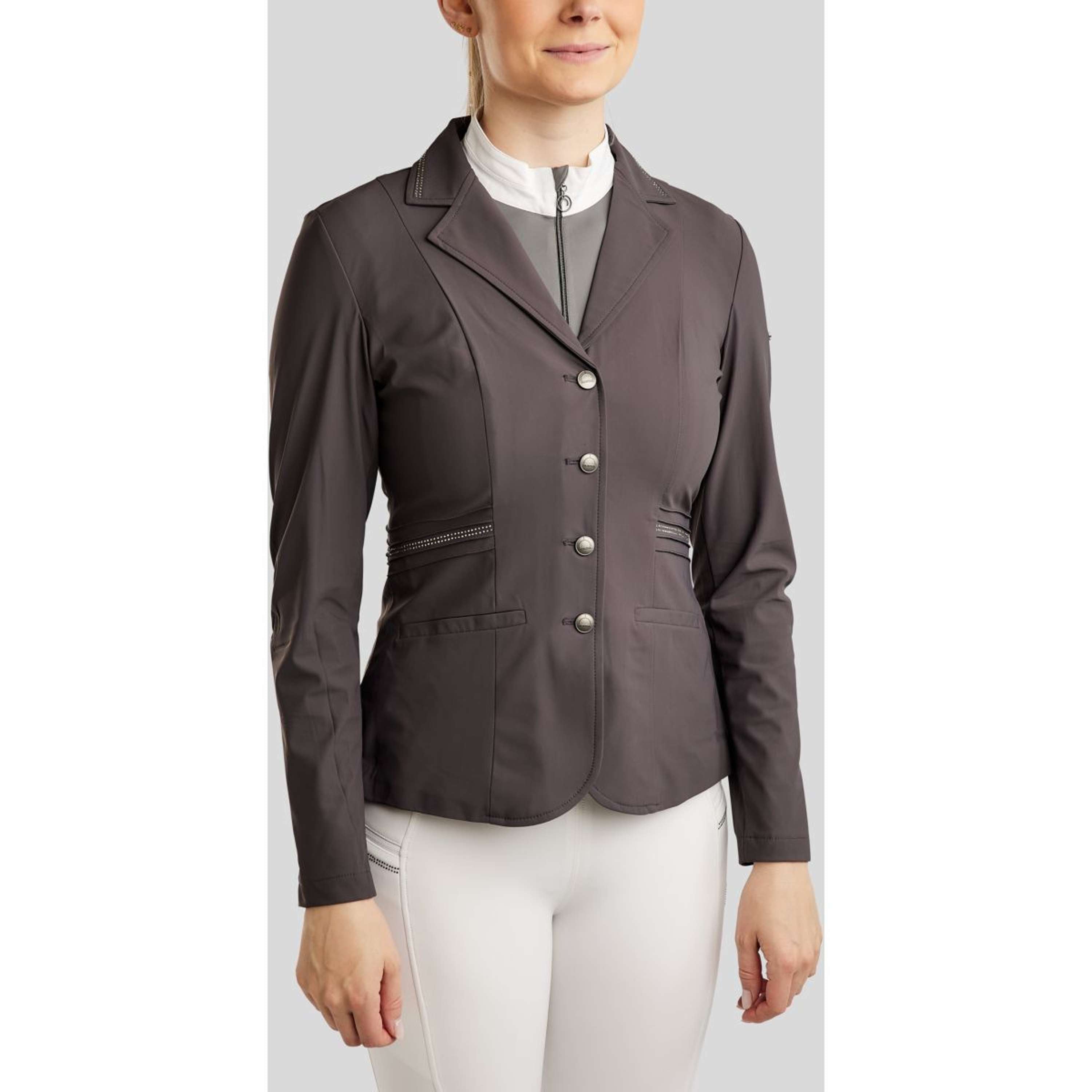 De prachtige kristallen details van geweermetaal geven de jas een exclusieve en elegante uitstraling. Twee rijen fonkelende kristallen sieren de kraag en lopen langs de taille tussen de fijne pintucks, waardoor de vrouwelijke silhouet wordt benadrukt en een verfijnde en stijlvolle look ontstaat. De kristallen geven een luxueuze touch die het licht prachtig vangt – perfect voor de modebewuste rijder.