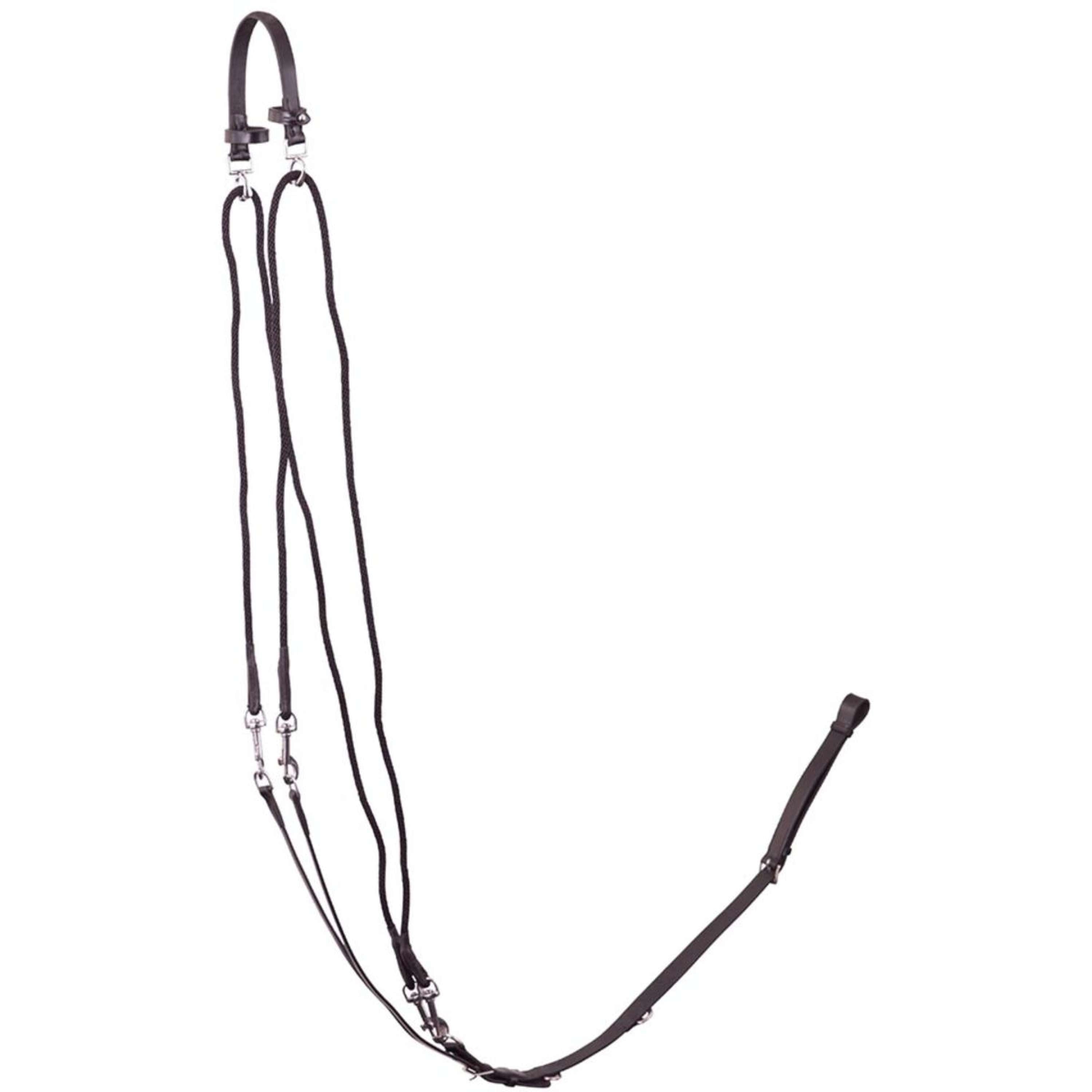De zachte nylon koorden zijn makkelijk te bevestigen met musketons en lopen via de bitringen naar de ringen (voorzien van rollers) aan het lederen kopstuk. Vervolgens gaan ze weer terug naar het borststuk, waar je ze opnieuw kunt vastmaken met een musketon aan een van de drie D-ringen. Het resultaat? Een handig systeem dat voorkomt dat je paard zijn hals te ver strekt.