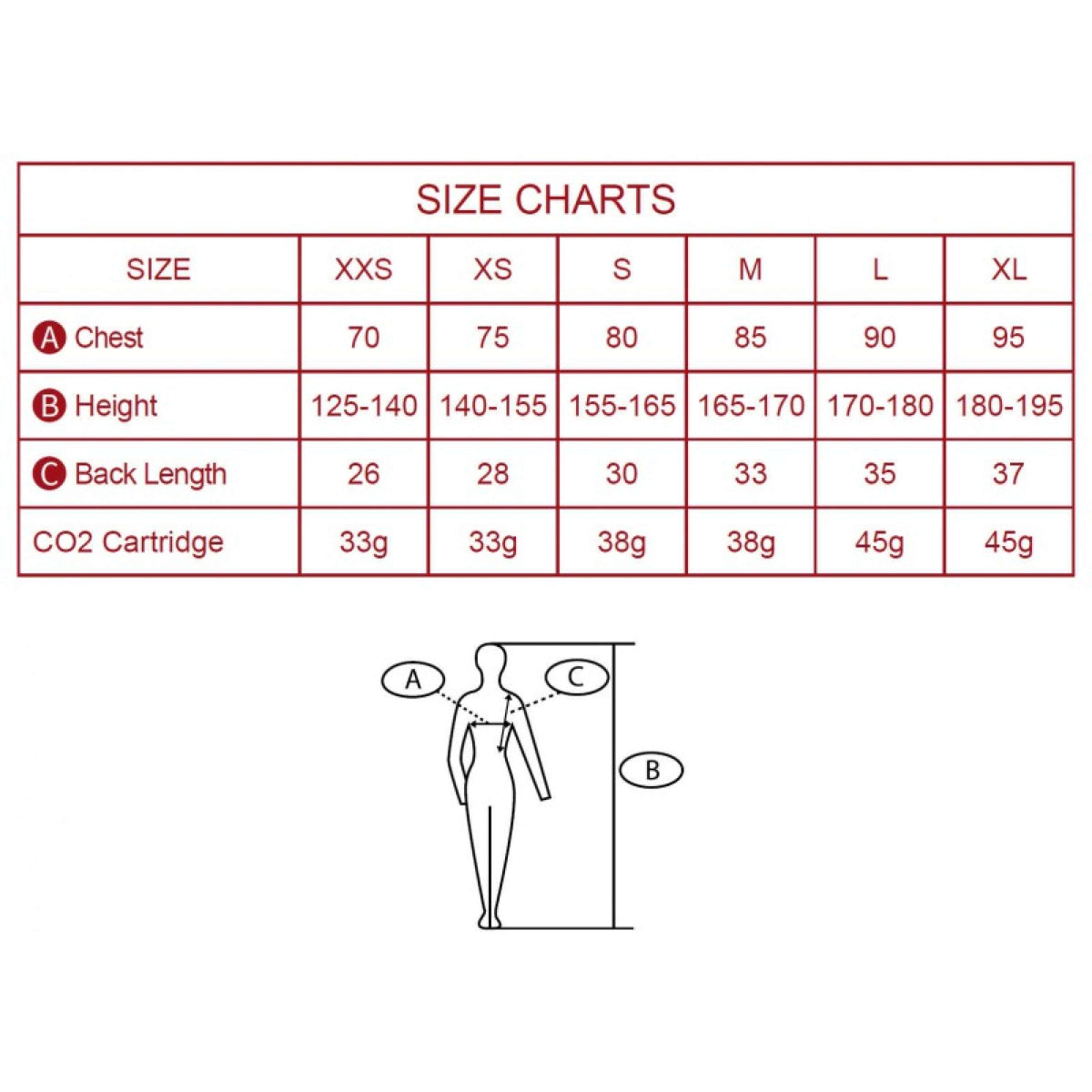 - Let op: Maten van het gilet en de cartridge zijn gewijzigd. Volg de aanbevolen lengte voor elke maat.