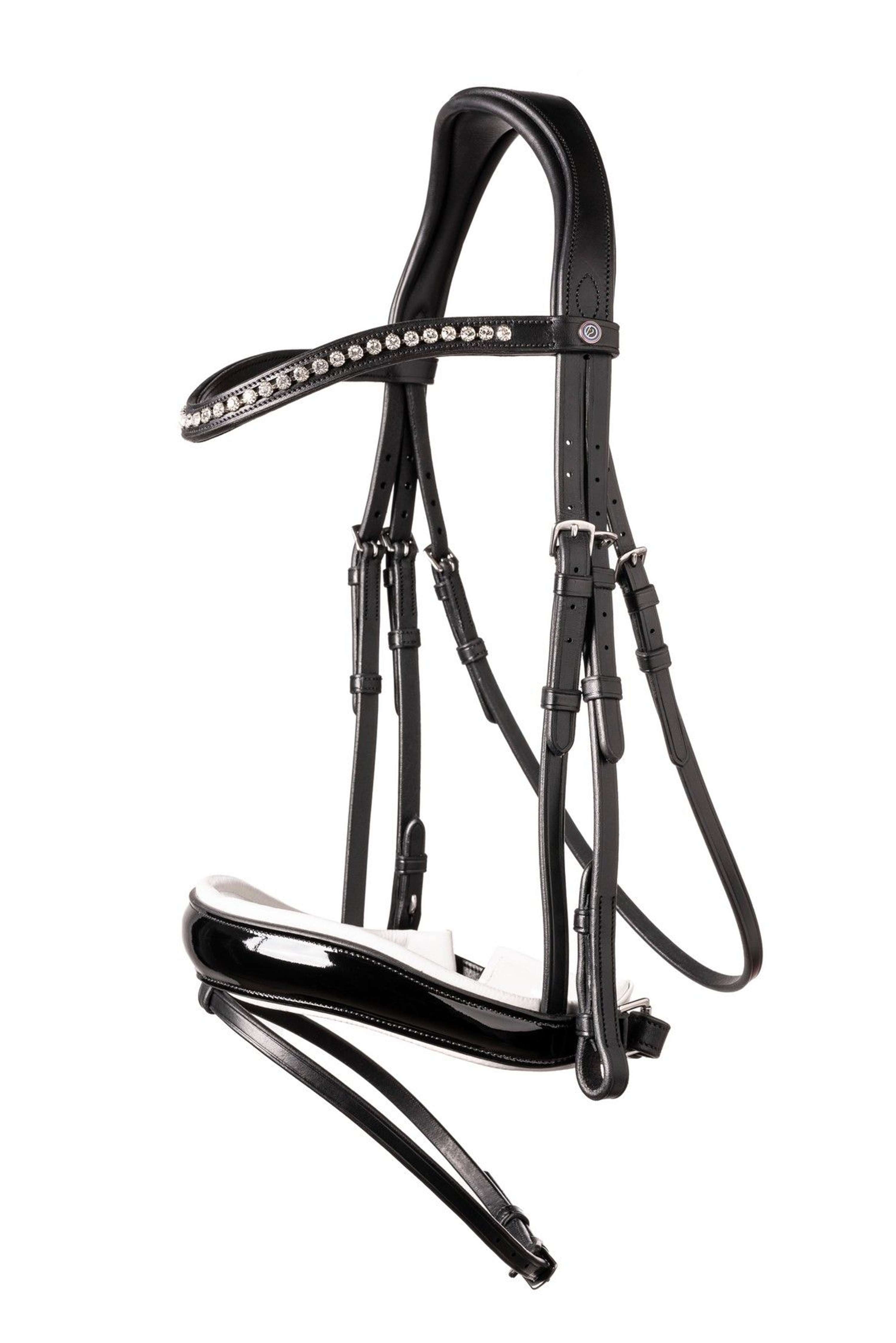 Het Trust Hoofdstel Rotterdam is perfect voor jou en je paard! Dit hoofdstel heeft een brede lakneusriem met super zachte padding voor extra comfort. De neusriem rekt niet uit dankzij de nylon voering, dus de pasvorm blijft altijd perfect. De smalle uiteinden van de neusriem geven je paard meer vrijheid bij het bit en het ontwerp zorgt voor meer ruimte in het midden. Dit maakt de neusriem dubbel anatomisch. De sperriem heeft een buckle protector, zodat de gesp nooit tegen de neus van het paard komt. De frontriem is versierd met Stelluxโข steentjes die netjes vastzitten en voor een elegante uitstraling zorgen. Ook is de frontriem licht gebogen voor een mooie look.