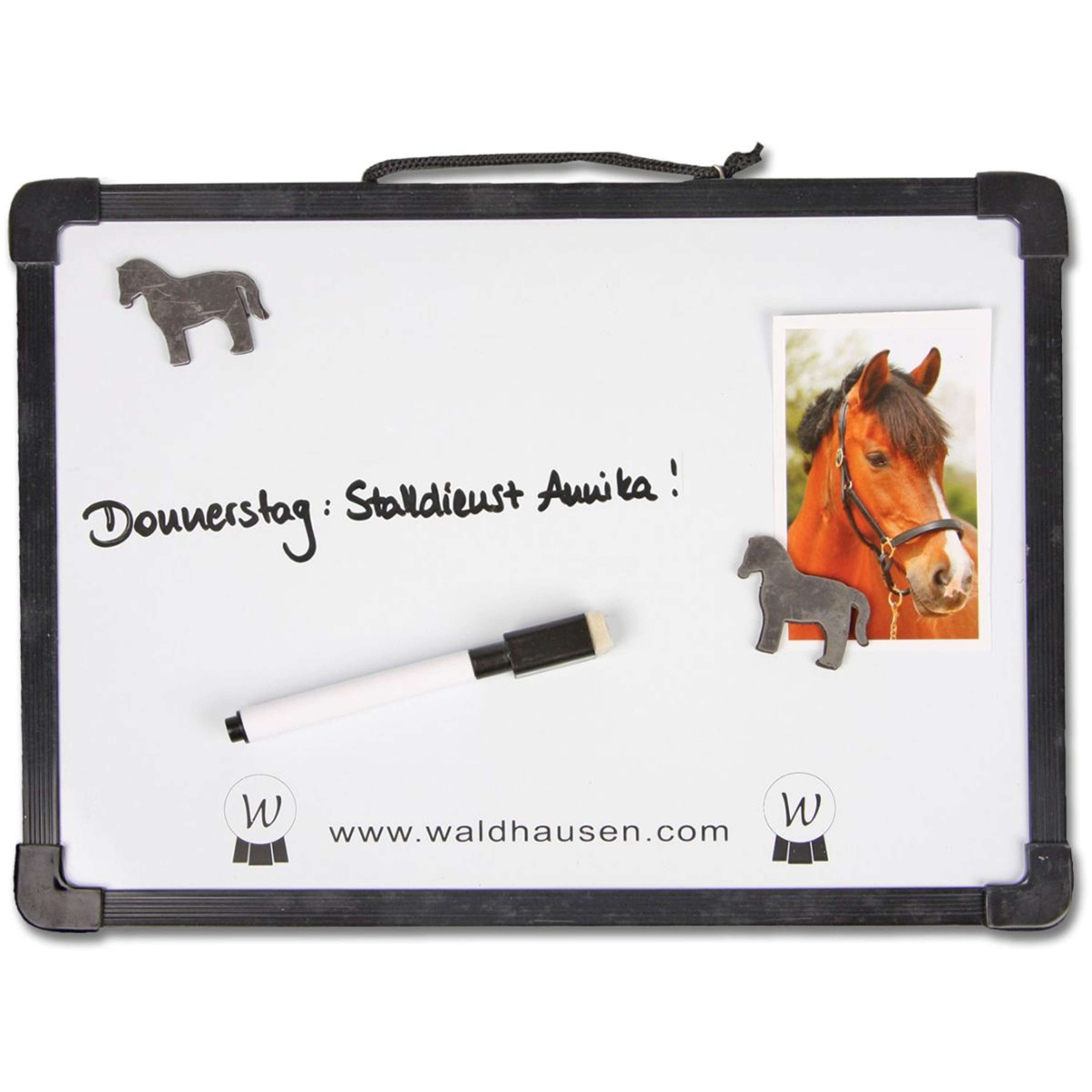 Geen gedoe meer met het opschrijven van belangrijke informatie in de stal. Dit handige Waldhausen stalbord met stift biedt de perfecte oplossing voor het organiseren van je paardenstalling. Het stevige plastic prikbord komt met een marker en twee schattige paardvormige magneten, zodat je meteen aan de slag kunt.